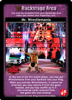 At the end of the Pre-match phase, you may put Wrestlemania from your Backlash into your Ring. When you Activate Wrestlemania, it cannot be reversed; you may remove it from the game instead, and you may shuffle up to 5 non-reversal cards removed from the game into your Arsenal.