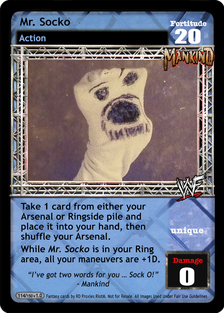 Take 1 card from either your Arsenal or Ringside pile and place it into your hand, then shuffle your Arsenal. While Mr. Socko is in your Ring area, all your maneuvers are +1D.