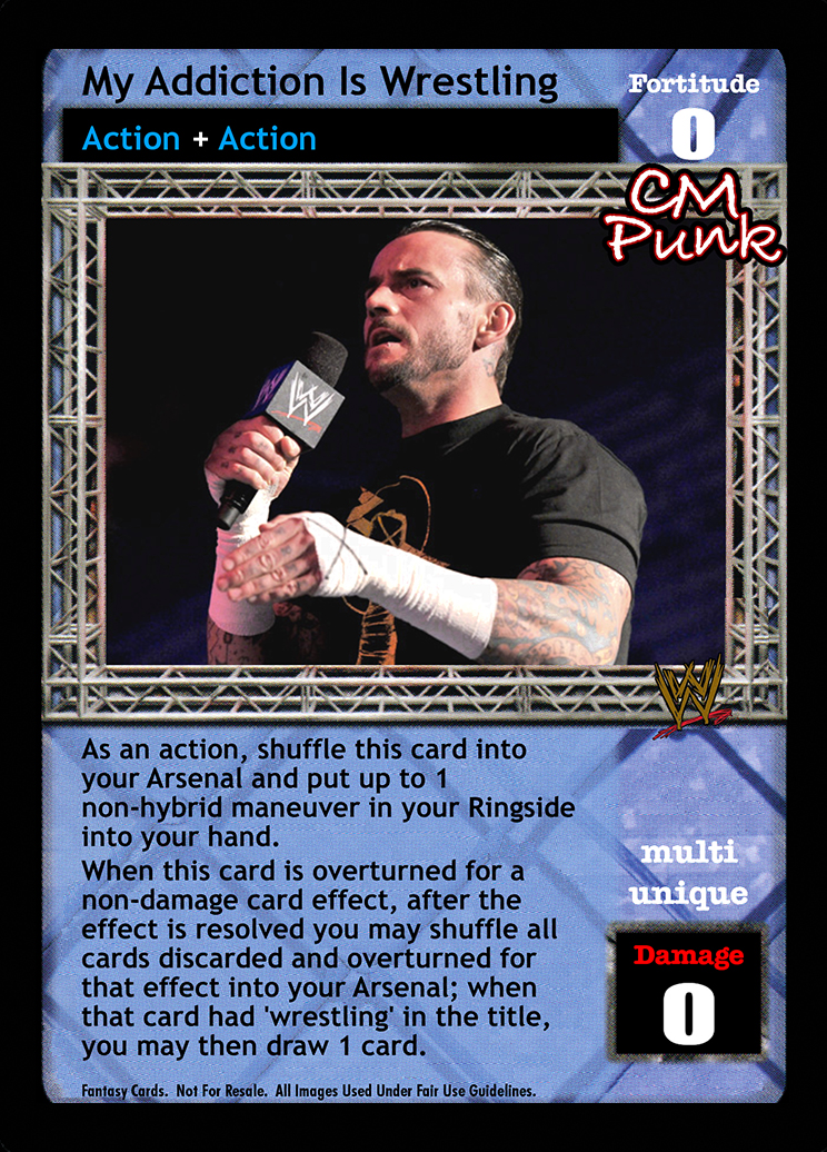 As an action, shuffle this card into your Arsenal and put up to 1 non-hybrid maneuver in your Ringside into your hand. When this card is overturned for a non-damage card effect, after the effect is resolved you may shuffle all cards discarded and overturned for that effect into your Arsenal; when that card had 'wrestling' in the title, you may then draw 1 card.