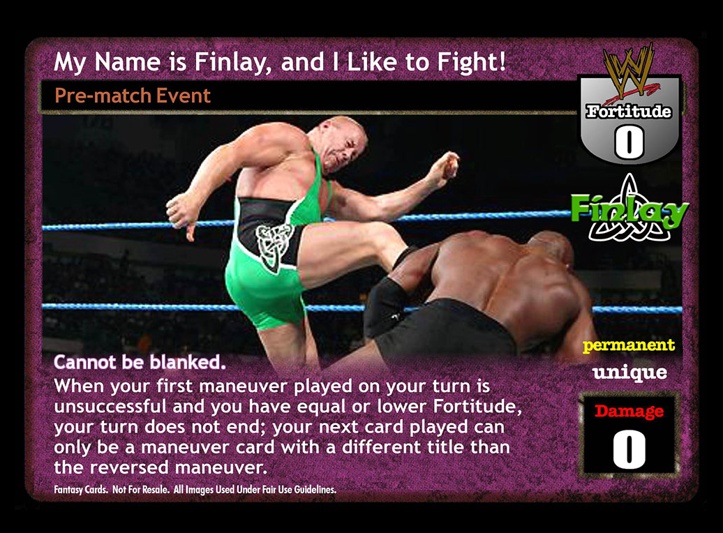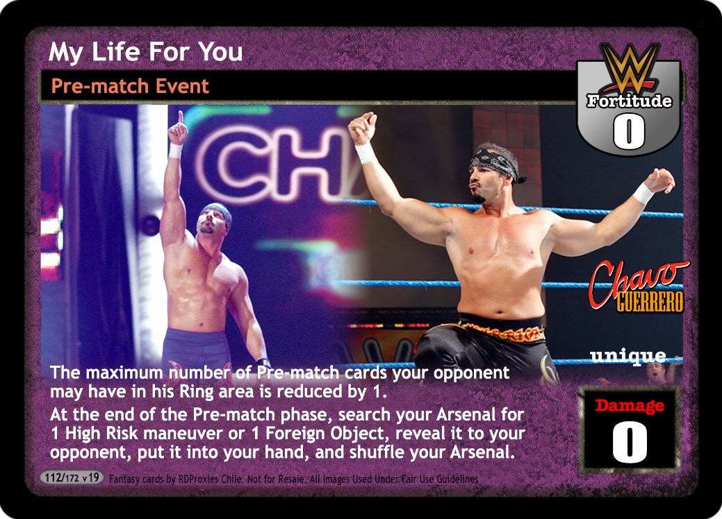 The maximum number of Pre-match cards your opponent may have in his Ring area is reduced by 1. At the end of the Pre-match phase, search your Arsenal for 1 High Risk maneuver or 1 Foreign Object, reveal it to your opponent, put it into your hand, and shuffle your Arsenal.