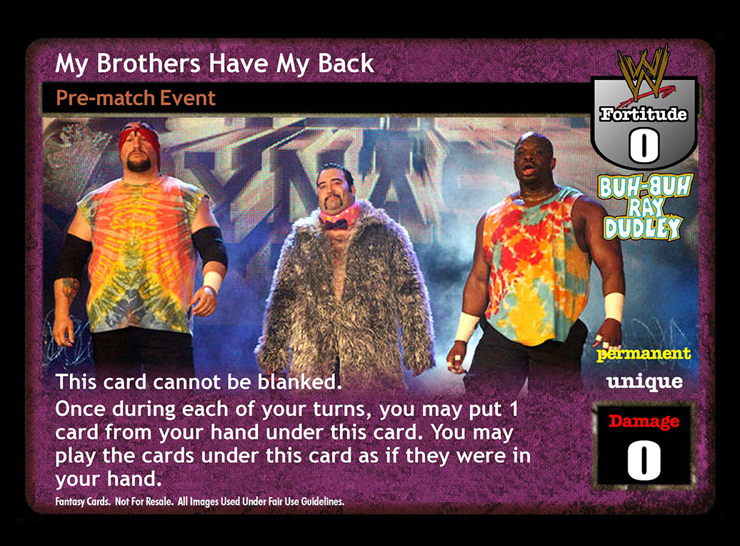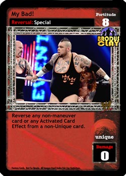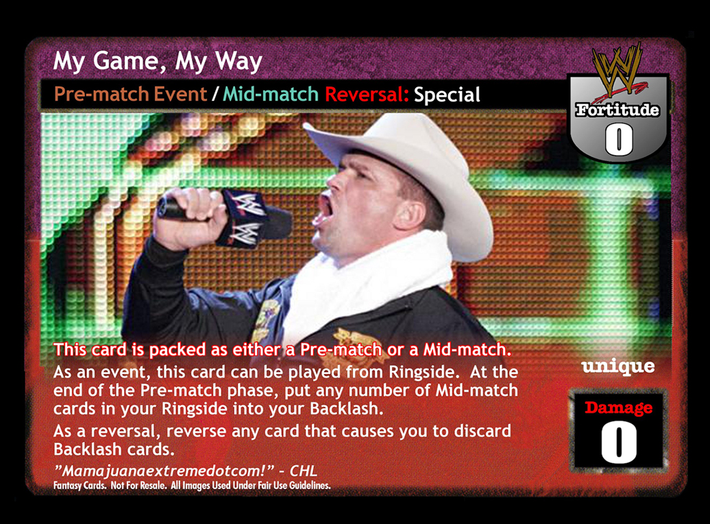 This card is packed as a Pre-match or a Mid-match. As an event, this card can be played from Ringside. At the end of the Pre-match phase, put any number of Mid-match cards in your Ringside into your Backlash. As a reversal, reverse any card that causes you to discard Backlash cards.