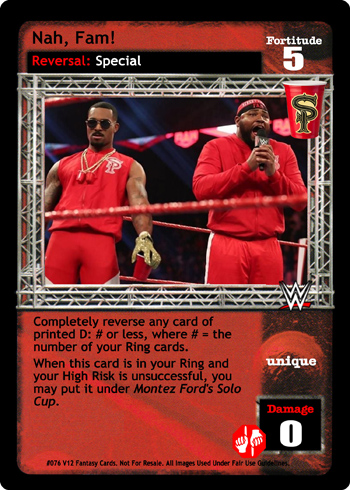 Completely reverse any card of printed D: # or less, where # is equal to the number of your Ring cards. When this card is in your Ring and your High Risk is unsuccessful, you may put it under Montez Ford's Solo Cup.