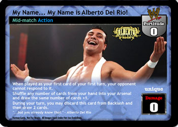 Can only be played as your first card of your first turn, and your opponent cannot respond to it. Shuffle any number of cards from your hand into your Arsenal and draw the same number of cards +1. During your turn, you may discard this card from Backlash to draw 2 cards.
