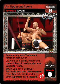 Reverse any non-Trademark Finisher maneuver. Draw up to # cards, where # is the number of cards under your Superstar card. When you have 6+ lower Fortitude and this card reverses from Arsenal, put it under your Superstar card instead.