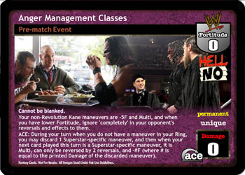 Cannot be blanked. Your non-Revolution Kane maneuvers are -5F and Multi, and when you have lower Fortitude, ignore 'completely' in your opponent's reversals and effects to them. ACE: During your turn when you do not have a maneuver in your Ring, you may discard 1 Superstar-specific maneuver, and then when your next card played this turn is a Superstar-specific maneuver, it is Multi, can only be reversed by 2 reversals, and -#F (where # is equal to the printed Damage of the discarded maneuver).