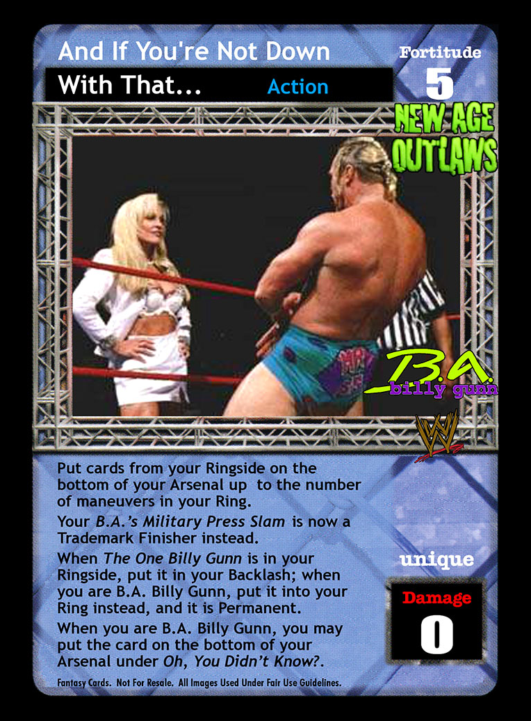 Put cards from your Ringside on the bottom of your Arsenal equal to the number of maneuvers in your Ring. Your B.A.'s Military Press Slam is now a Trademark Finisher instead. When The One Billy Gunn is in your Ringside, put it in your Backlash; when you are B.A. Billy Gunn, put it into your Ring instead, and it is Permanent. When you are B.A. Billy Gunn, you may put the card on the bottom of your Arsenal under Oh, You Didn't Know?.