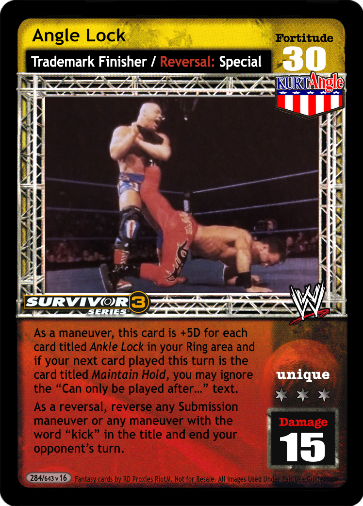 As a maneuver, this card is +5D for each card titled Ankle Lock in your Ring area and if your next card played this turn is the card titled Maintain Hold, you can ignore the "Can only be played after..." text. As a reversal, reverse any Submission maneuver or any maneuver with the word "kick" in the title and end your opponent's turn.
