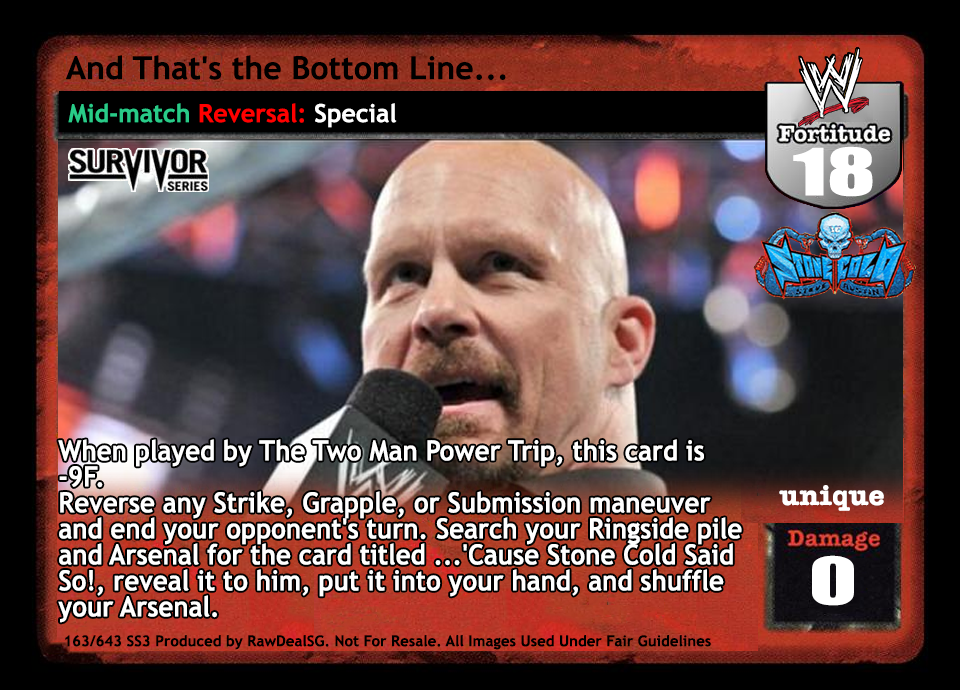 Reverse any Strike, Grapple, or Submission maneuver and end your opponent's turn. Look through your Ringside pile and then your Arsenal for the card titled ... 'Cause Stone Cold Said So! and place that card in your hand, then shuffle your Arsenal if you looked through it. If played by the Two Man Power Trip this card is F:9, if played by Stone Cold Steve Austin this card is F:18.