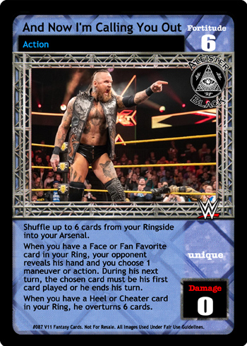 Shuffle up to 6 cards from your Ringside into your Arsenal. When you have a Face or Fan Favorite card in your Ring, your opponent reveals his hand and you choose 1 maneuver or action. During his next turn, the chosen card must be his first card played or he ends his turn. When you have a Heel or Cheater card in your Ring, he overturns 6 cards.