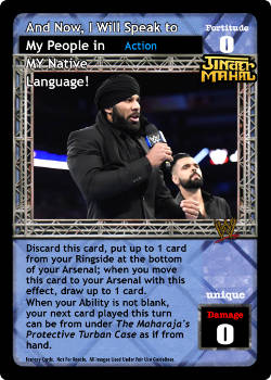Discard this card, put up to 1 card from your Ringside at the bottom of your Arsenal; when you move this card to your Arsenal with this effect, draw up to 1 card. When your Ability is not blank, your next card played this turn can be from under The Maharaja's Protective Turban Case as if from hand.