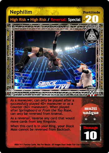 As a maneuver, can only be played after a successful 4D+ maneuver or as a Counter (6D+ maneuver). When played after Springboard or From the Top Rope, can only be reversed from Arsenal. As a reversal, reverse any card that would move cards from any Ringside. When this card is in your Ring, your Black Mass cannot be reversed from Backlash.