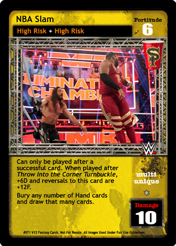 Can only be played after a successful card. When played after Throw Into the Corner Turnbuckle, +6D and reversals to this card are +12F. Bury any number of Hand cards and draw that many cards.