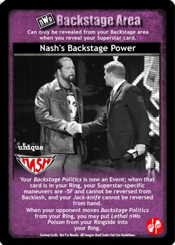 Your Backstage Politics is now an Event; when that card is in your Ring, your Superstar-specific maneuvers are -5F and cannot be reversed from Backlash, and your Jack-knife cannot be reversed from hand. When your opponent moves Backstage Politics from your Ring, you may put Lethal nWo Poison from your Ringside into your Ring.