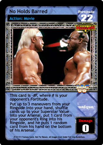 This card is -#F, where # is your opponent's Fortitude. Put up to 3 maneuvers from your Ringside into your hand, shuffle cards up to your Superstar Value into your Arsenal, put 1 card from your opponent's Ring into his Ringside, and he puts 1 random card from his hand on the bottom of his Arsenal.