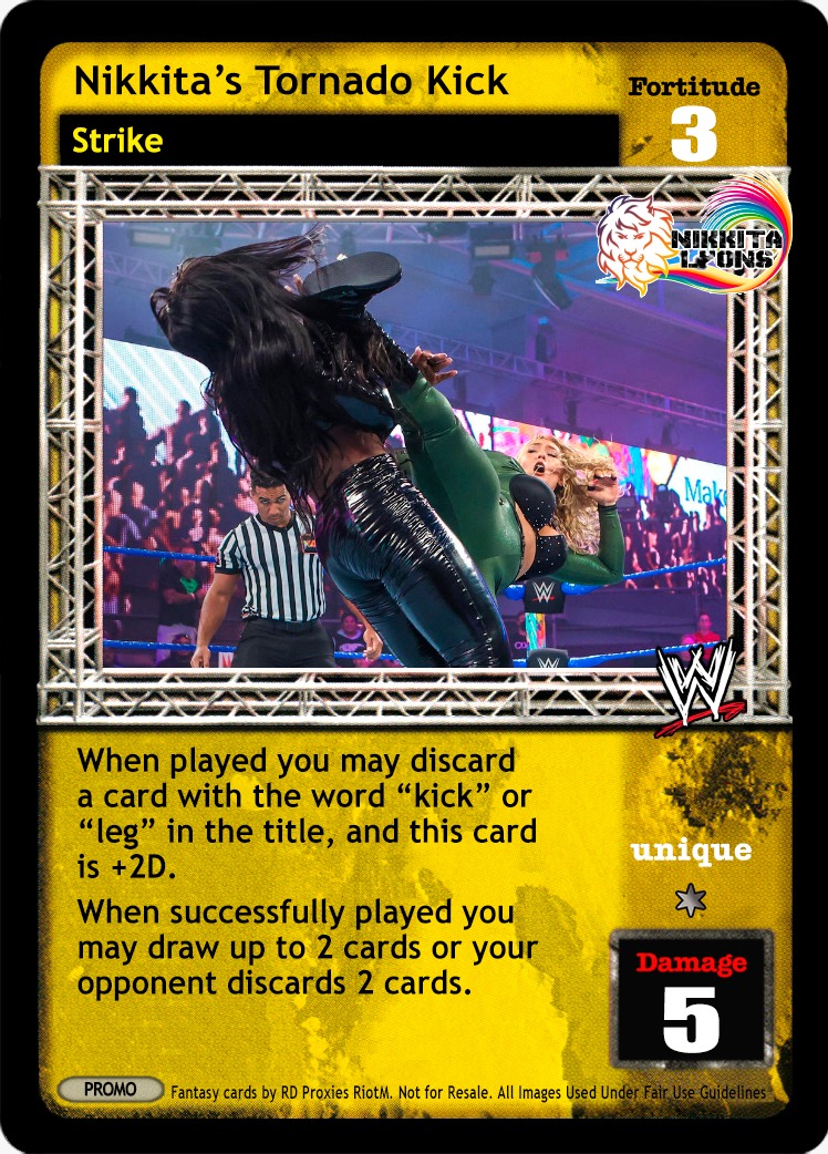When played you may discard a card with the word "kick" or "leg" in the title, and this card is +2D. When successfully played you may draw up to 2 cards or your opponent discards 2 cards.