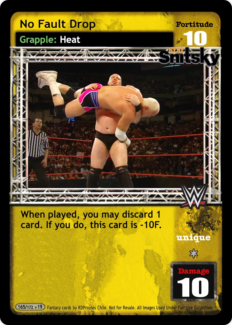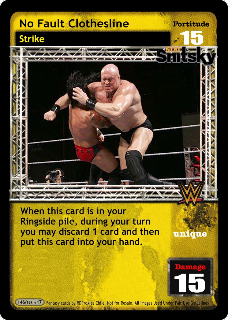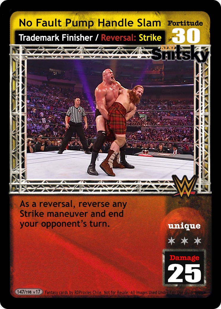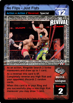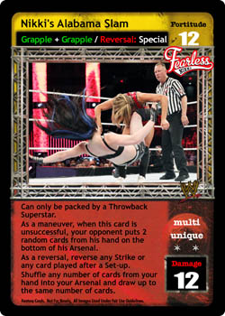 Can only be packed by a Throwback Superstar. As a maneuver, when this card is unsuccessful, your opponent puts 2 random cards from his hand on the bottom of his Arsenal. As a reversal, reverse any Strike or any card played after a Set-up. Shuffle any number of cards from your hand into your Arsenal and draw up to the same number of cards.
