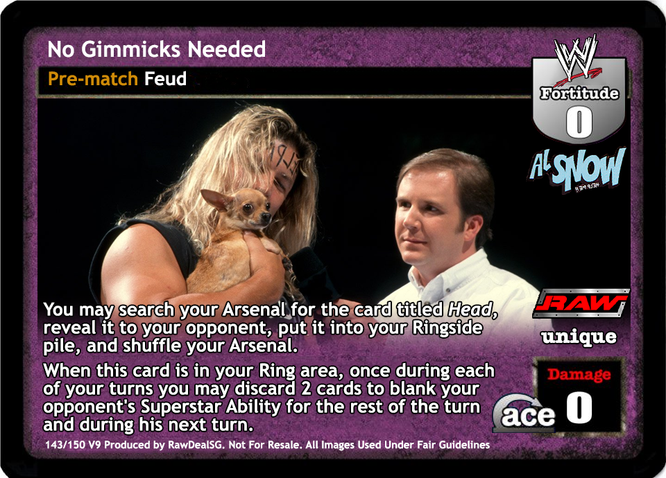 You may search your Arsenal for the card titled Head, reveal it to your opponent, put it into your Ringside pile, and shuffle your Arsenal. When this card is in your Ring area, once during each of your turns you may discard 2 cards to blank your opponent's Superstar Ability for the rest of the turn and during his next turn.