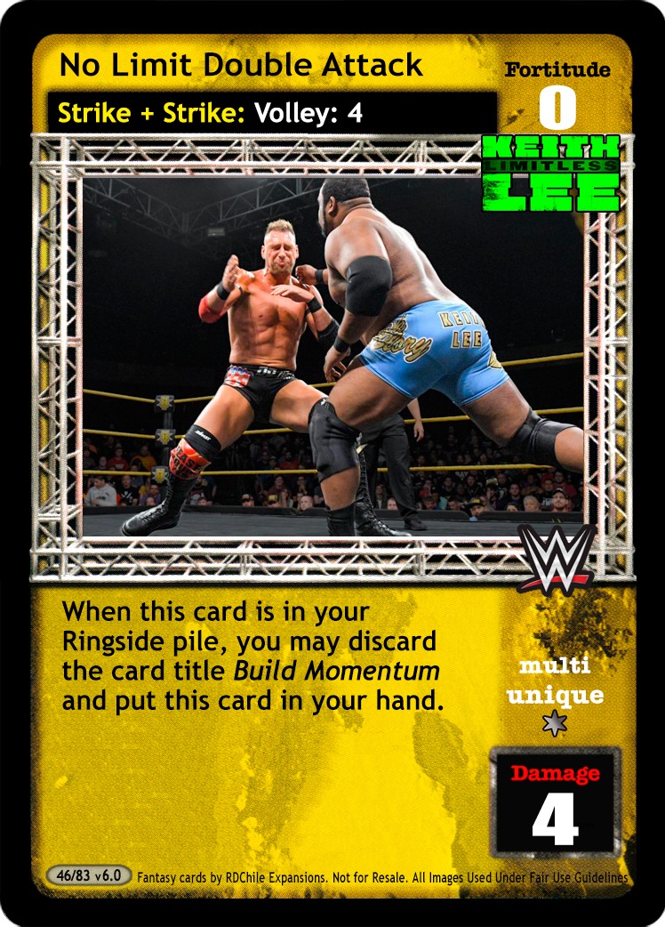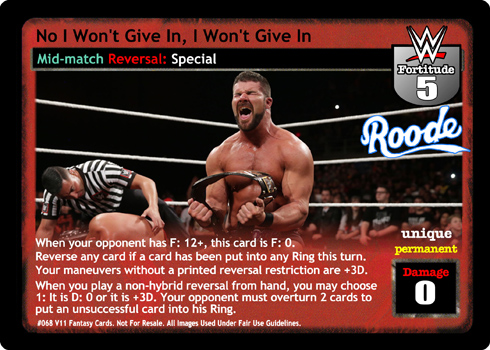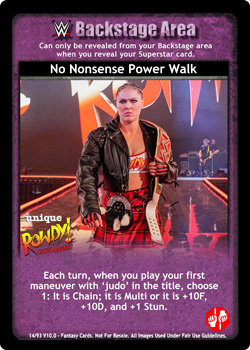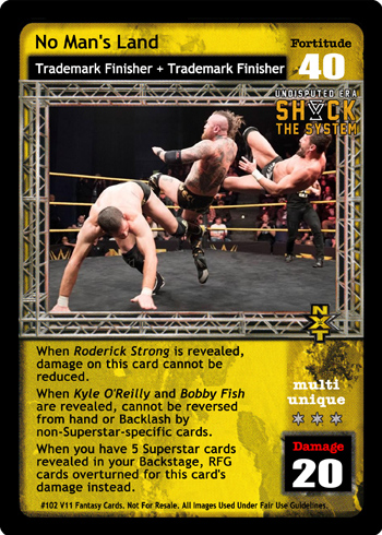 When Roderick Strong is revealed, damage on this card cannot be reduced. When Kyle O'Reilly and Bobby Fish are revealed, cannot be reversed from hand or Backlash by non-Superstar-specific cards. When you have 5 Superstar cards revealed, RFG cards overturned for this card's damage instead.