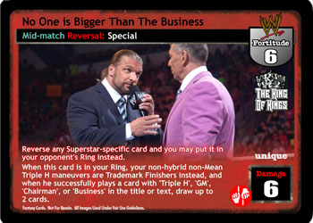 Reverse any Superstar-specific card and you may put it in your opponent's Ring instead. When this card is in your Ring, your non-hybrid non-Mean Triple H maneuvers are Trademark Finishers instead, and when he successfully plays a card with 'Triple H', 'GM', 'Chairman', or 'Business' in the title or text, draw up to 2 cards.