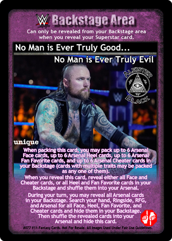 When packing this card, you may pack up to 6 Arsenal Face cards, up to 6 Arsenal Heel cards, up to 6 Arsenal Fan Favorite cards, and up to 6 Arsenal Cheater cards in your Backstage (cards with multiple traits may be packed as any one of them). When you reveal this card, reveal either all Face and Cheater cards, or all Heel and Fan Favorite cards in your Backstage and shuffle them into your Arsenal. During your turn, you may reveal all Arsenal cards in your Backstage. Search your hand, Ringside, RFG, and Arsenal for all Face, Heel, Fan Favorite, and Cheater cards and hide them in your Backstage. Then shuffle the revealed cards into your Arsenal and hide this card.