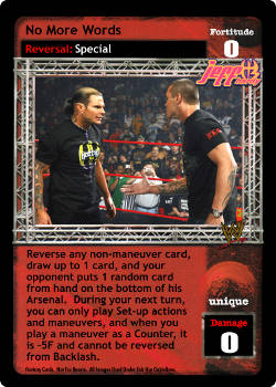 Reverse any non-maneuver card, draw up to 1 card, and your opponent puts 1 random card from hand on the bottom of his Arsenal. During your next turn, you can only play Set-up Actions and maneuvers, and when you play a maneuver as a Counter, it is -5F and cannot be reversed from Backlash.