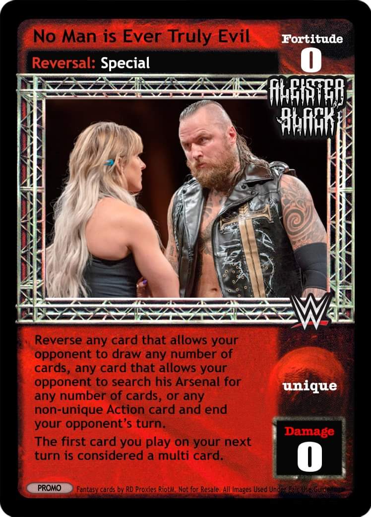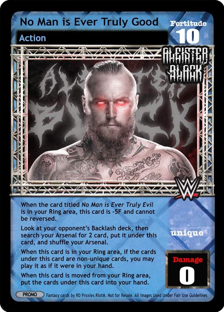 when the card title No Man is Ever Truly Evil is in your ring area, this card is -5F and cannot be reversed. look at your opponents backlash deck, then search your arsenal for 2 card, put it under this card and shuffle your arsenal. when this card is in your ring area, if the cards under this card are non-unique cards, you may play it as if it were in your hand. when this card is moved from your ring area, put the cards under this card into your hand