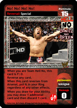 When you are Team Hell No, this card is F: 0. Reverse any card. When this card reverses from Arsenal, put it in your Ring regardless of any other effects. When you draw for your Ability, you may draw 1 additional card and then discard 1 card.