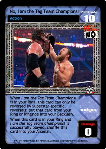 When I am the Tag Team Champions! is in your Ring, this card can only be reversed by Superstar-specific reversals; put that card from your Ring or Ringside into your Backlash. When this card is in your Ring and I am the Tag Team Champions! is successfully played, shuffle this card into your Arsenal.