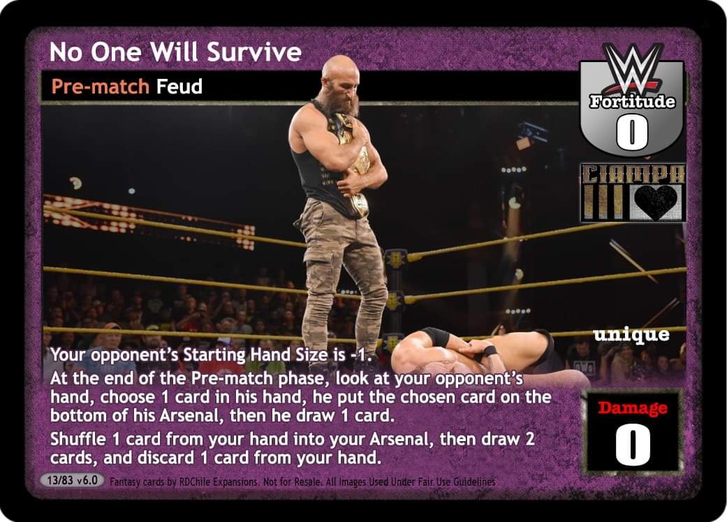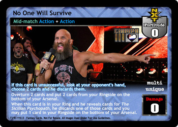 If this card is unsuccessful, look at your opponent's hand, choose 2 cards and he discards them. Overturn 2 cards and put 2 cards from your Ringside on the bottom of your Arsenal. When this card is in your Ring and he reveals cards for The Sicilian Psychopath, he discards one of those cards and you may put 1 card in your Ringside on the bottom of your Arsenal.