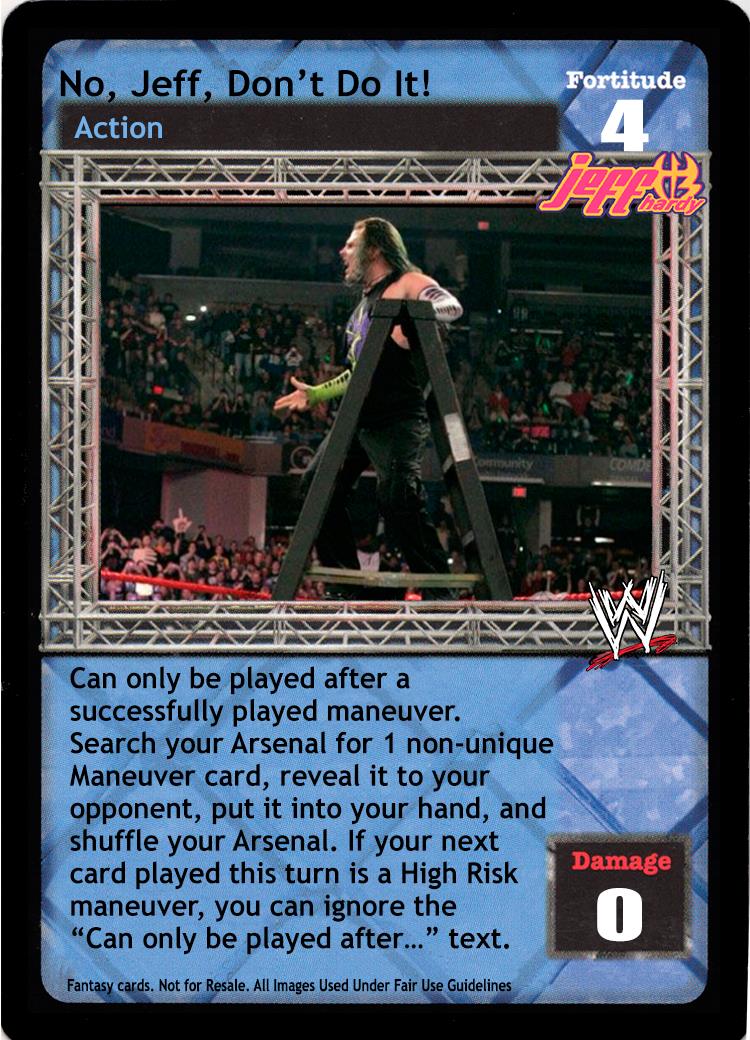 Can only be played after a successfully played maneuver. Search your Arsenal for 1 non-unique Maneuver card, reveal it to your opponent, put it into your hand, and shuffle your Arsenal. If your next card played this turn is a High Risk maneuver, you can ignore the "Can only be played after..." text.