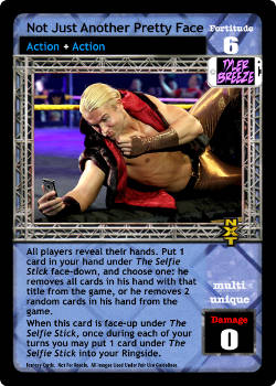 All players reveal their hands. Put 1 card in your hand under The Selfie Stick face-down, and choose one: he removes all cards in his hand with that title from the game, or he removes 2 random cards in his hand from the game. When this card is face-up under The Selfie Stick, once during each of your turns you may put 1 card under The Selfie Stick into your Ringside.