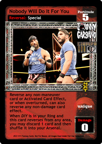 Reverse any non-maneuver card or Activated Card Effect, or when overturned, can also reverse any non-damage card effect. When DIY is in your Ring and this card reverses from any area, you may discard 1 card and then shuffle it into your Arsenal.