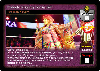 Cannot be blanked. After all Pre-match have been resolved, you may discard 1 random card; if you do, you start the game. When your first maneuver played on a turn is unsuccessful, your opponent puts 1 random card from his hand on the bottom of his Arsenal.