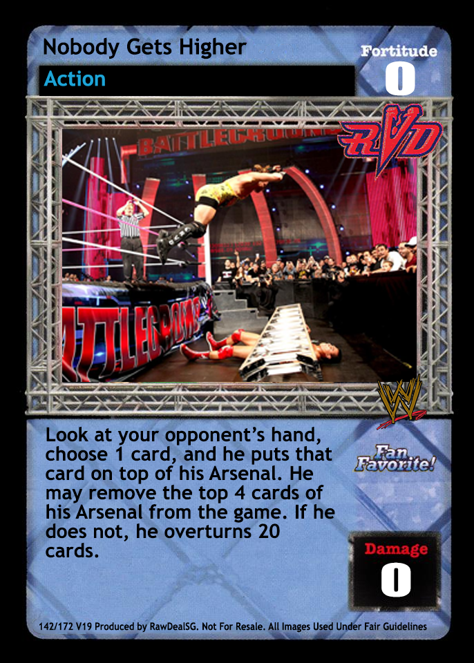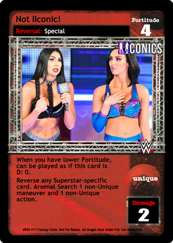 When you have lower Fortitude, can be played as if this card is D: 0. Reverse any Superstar-specific card. Arsenal Search 1 non-Unique maneuver and 1 non-Unique action.