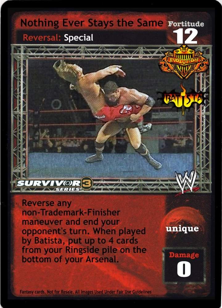 Reverse any non-Trademark-Finisher maneuver and end your opponent's turn. When played by Batista, put up to 4 cards from your Ringside pile on the bottom of your Arsenal.