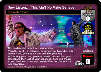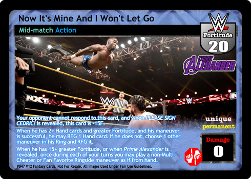 Your opponent cannot respond to this card, and when PLEASE SIGN CEDRIC! is revealed, this card is -15F. When he has 2+ Hand cards and greater Fortitude, and his maneuver is successful, he may RFG 1 Hand card. If he does not, choose 1 other maneuver in his Ring and RFG it. When he has 15+ greater Fortitude, or when Prime Alexander is revealed, once during each of your turns you may play a non-Multi Cheater or Fan Favorite Ringside maneuver as if from hand.