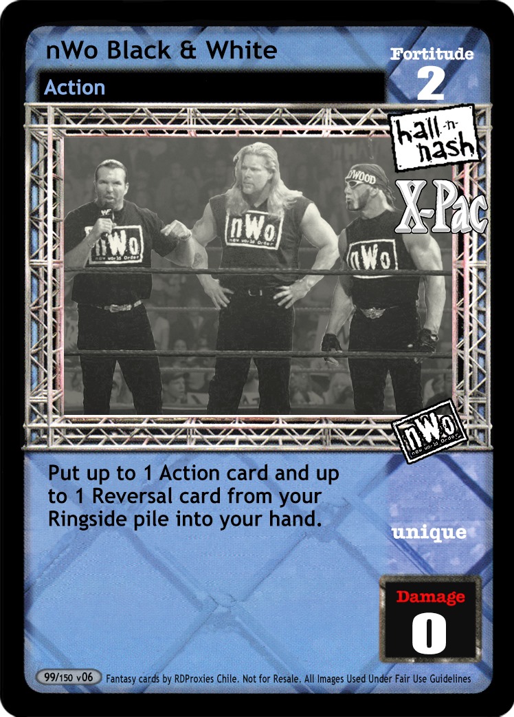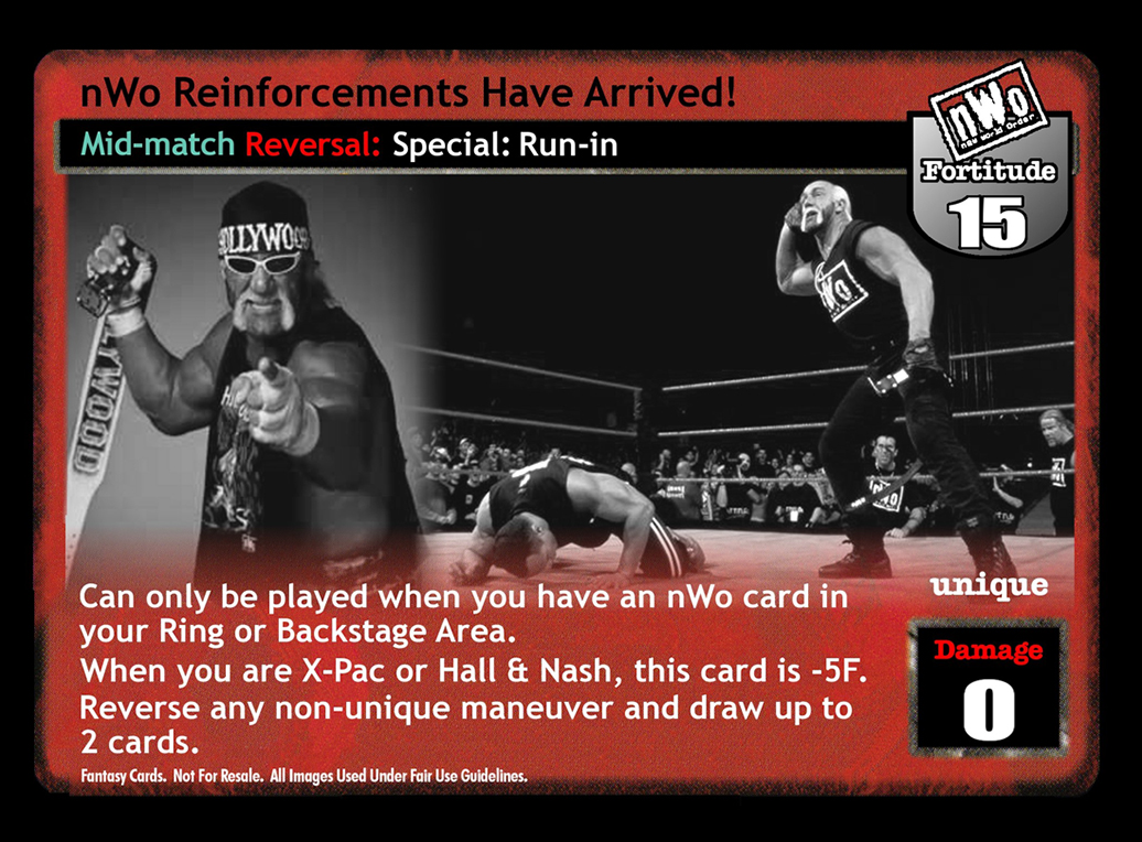 Can only be played when you have an nWo card in your Ring or Backstage Area. When you are Hall and Nash or X-Pac, this card is -5F. Reverse any non-unique maneuver and draw up to 2 cards.