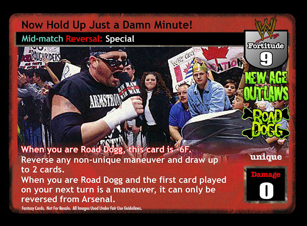 When you are Road Dogg, this card is -6F. Reverse any non-unique maneuver and draw up to 2 cards. When you are Road Dogg and the first card played on your next turn is a maneuver, it can only be reversed from Arsenal.