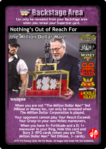 When you are not 'The Million Dollar Man' Ted DiBiase or Money Inc, can only be revealed when The Million Dollar Corporation is played. Your opponent cannot play Your Reach Exceeds Your Grasp to your non-Volley maneuvers. When you have 5+ Fortitude and a D: 1+ maneuver in your Ring, hide this card and Bury 2- RFG cards (when you are 'The Million Dollar Man' Ted DiBiase, 3- cards).