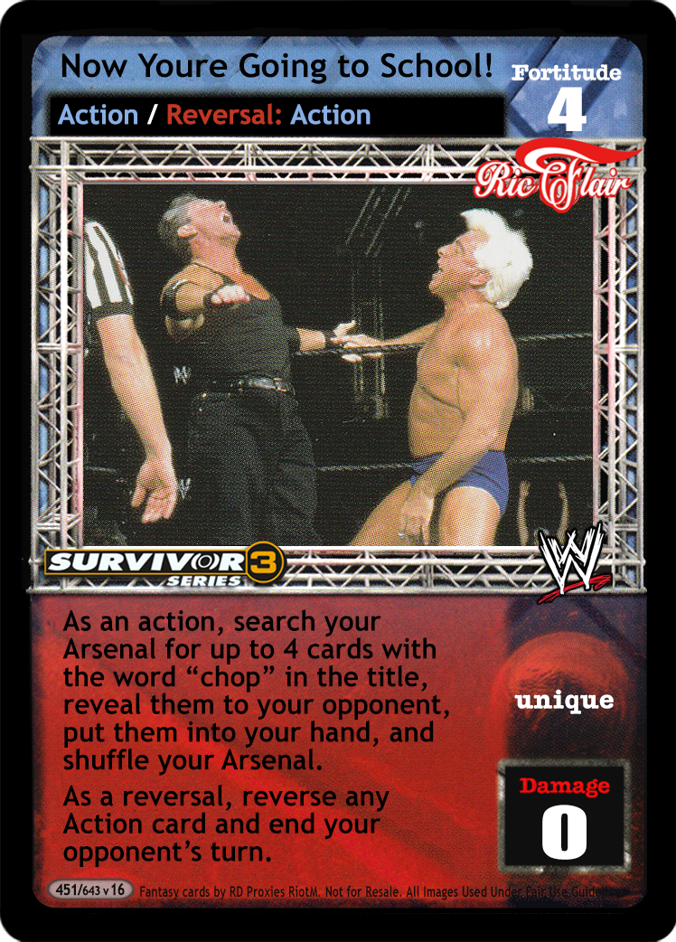 As an action, search your Arsenal for up to 4 cards with the word "chop" in the title, reveal them to your opponent, put them into your hand, and shuffle your Arsenal. As a reversal, reverse any Action card and end your opponent's turn.