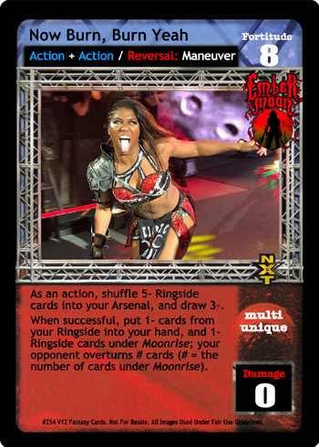 As an action, shuffle 5- Ringside cards into your Arsenal, and draw 3-. When successful, put 1- Ringside cards into your hand, and 1- Ringside cards under Moonrise; your opponent overturns # cards, where # is the number of cards under Moonrise.