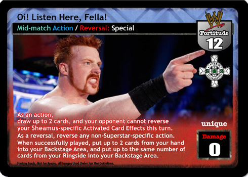 As an action, draw up to 2 cards, and your opponent cannot reverse your Sheamus-specific Activated Card Effects this turn. As a reversal, reverse any non-Superstar-specific Action. When successfully played, put up to 2 cards from your hand into your Backstage Area, and put up to the same number of cards from your Ringside into your Backstage Area.
