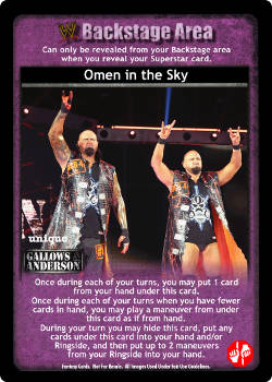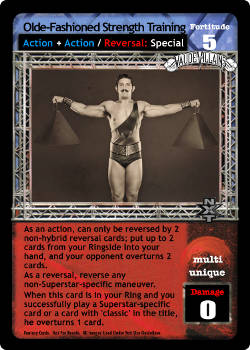 As an action, can only be reversed by 2 non-hybrid reversal cards; put up to 2 cards from your Ringside into your hand, and your opponent overturns 2 cards. As a reversal, reverse any non-Superstar-specific maneuver. When this card is in your Ring and you successfully play a Superstar-specific card or a card with 'classic' in the title, he overturns 1 card.