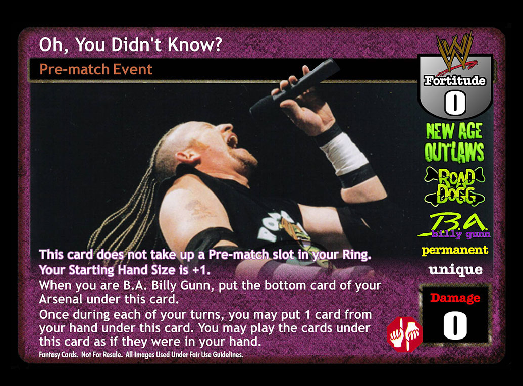 This card does not take up a Pre-match slot in your Ring. Your Starting Hand Size is +1. When you are B.A. Billy Gunn, put the bottom card of your Arsenal under this card. Once during each of your turns, you may put 1 card from your hand under this card. You may play the cards under this card as if they were in your hand.