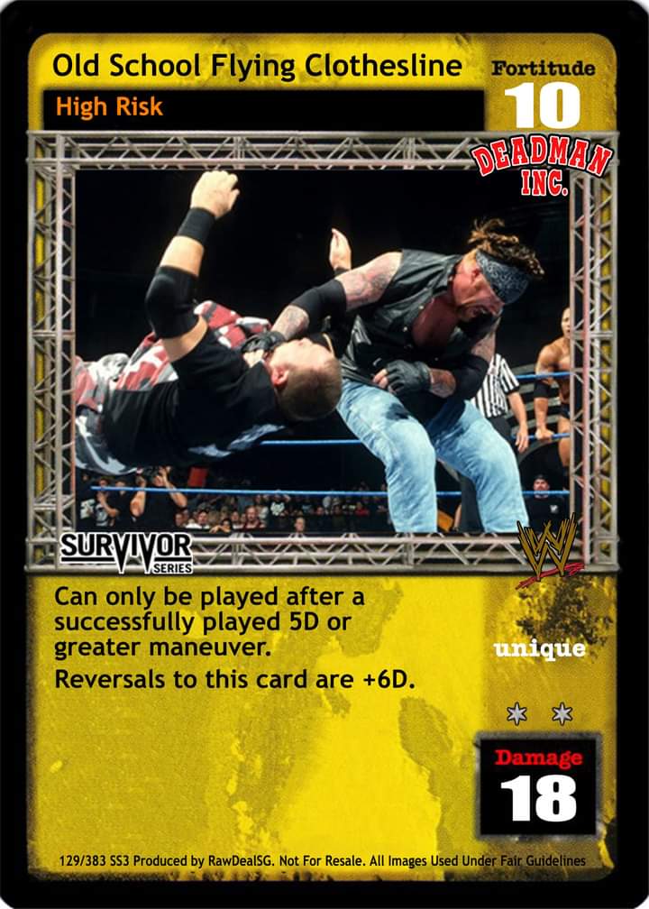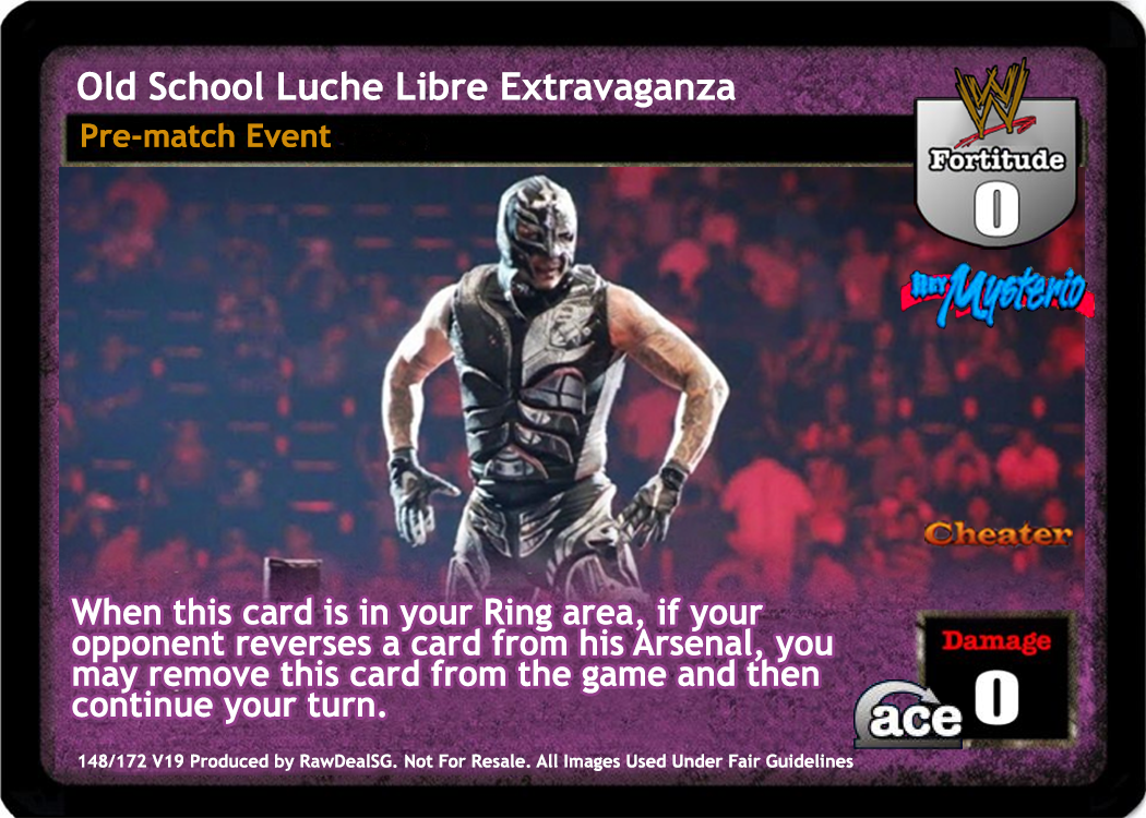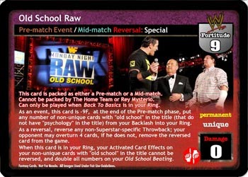 This card is packed as either a Pre-match or a Mid-match. Cannot be packed by The Home Team or Rey Mysterio. Can only be played when Back To Basics is in your Ring. As an event, this card is -9F, at the end of the Pre-match phase, put any number of non-unique cards with 'old school' in the title (that do not have 'psychology' in the title) from your Backlash into your Ring. As a reversal, reverse any non-Superstar-specific Throwback; your opponent may overturn 4 cards, if he does not, remove the reversed card from the game. When this card is in your Ring, your Activated Card Effects on your non-unique cards with 'old school' in the title cannot be reversed, and double all numbers on your Old School Beating.