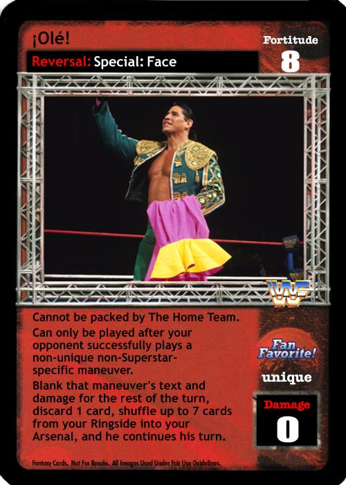 Cannot be packed by The Home Team. Can only be played after your opponent successfully plays a non-unique non-Superstar Specific maneuver. Blank that maneuver's text and damage for the rest of the turn, discard 1 card, shuffle up to 7 cards from your Ringside into your Arsenal, and he continues his turn.