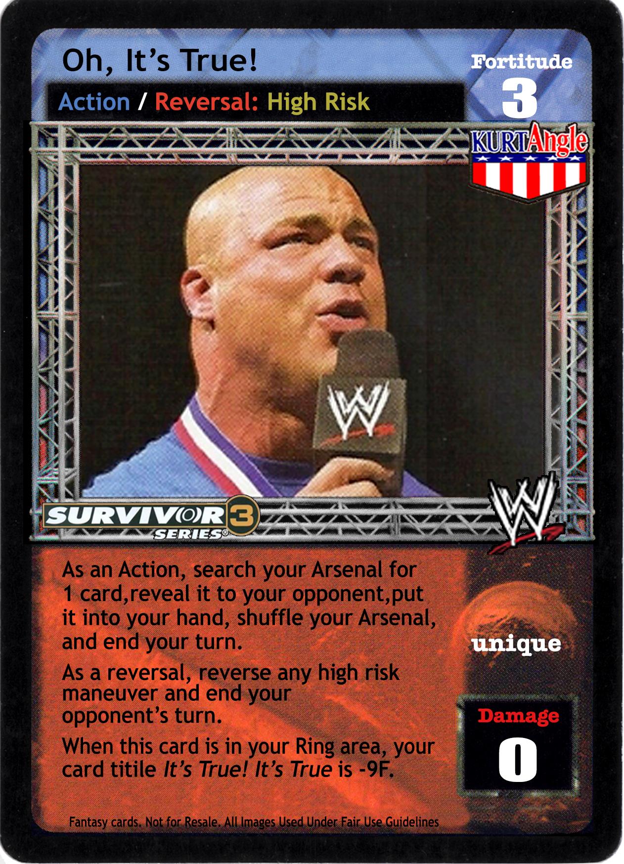 As an action, search your Arsenal for 1 card, reveal it to your opponent, put it into your hand, shuffle your Arsenal, and end your turn. As a reversal, reverse any High Risk maneuver and end your opponent's turn. When this card is in your Ring area, your card titled It's True! It's True! is -9F.