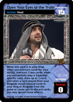 When this card is in your Ring: when you overturn cards for your Ability, overturn 3 less cards; when you successfully play a Superstar specific card, draw up to 1 card; and when a card played from your Ringside would remove cards in your Ring or Ringside from the game or cause you to discard cards, you may ignore those effects.
