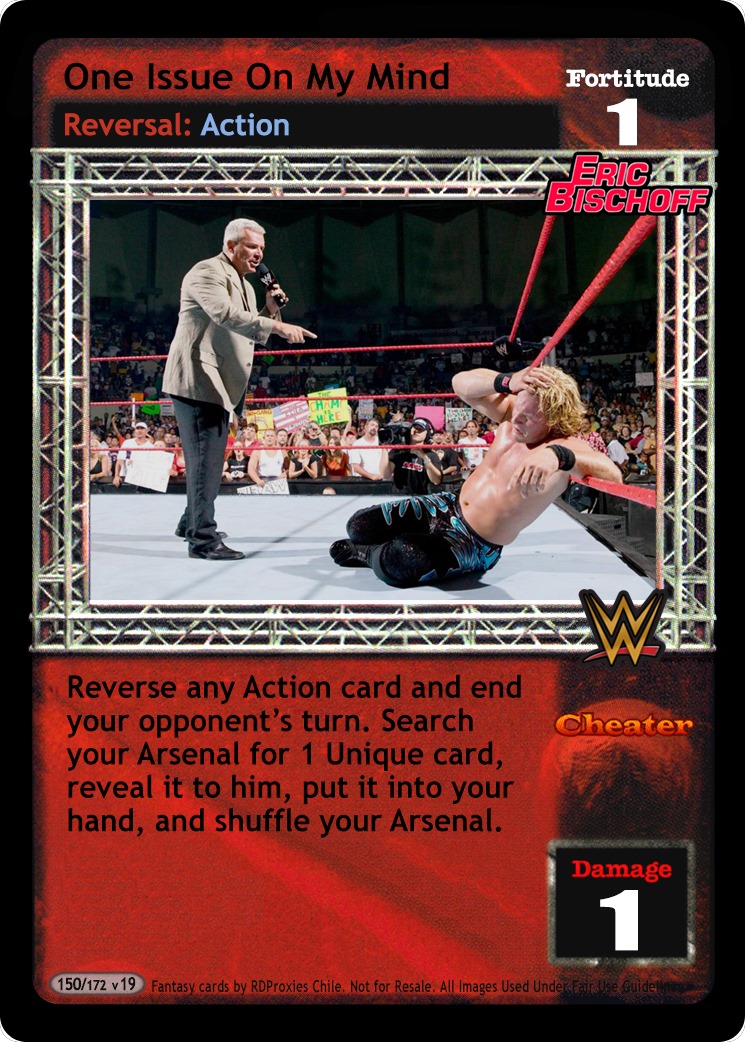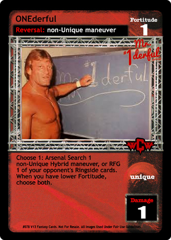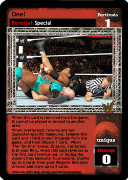 When this card is removed from the game, it cannot be played or moved to another area. When overturned, reverse any non-Superstar-specific maneuver, remove this card and 1 card in your Ringside from the game, and then discard 1 card. When The 'On One' Arena, Ontario, California is in your Ring, when this card reverses as the first card overturned, or during the Adam Crites Memorial Tournament, shuffle up to 2 cards from your Ringside into your Arsenal and draw up to 3 cards.