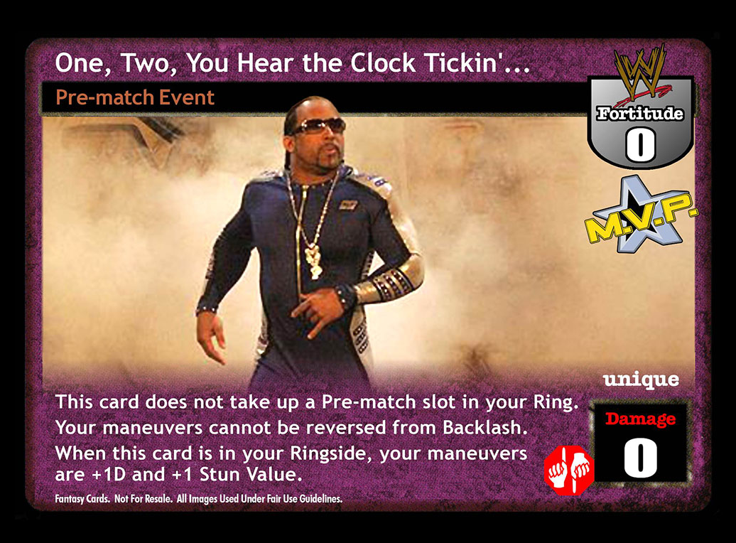 This card does not take up a Pre-match slot in your Ring. Your maneuvers cannot be reversed from Backlash. When this card is in your Ringside, your maneuvers are +1D and +1 Stun Value.